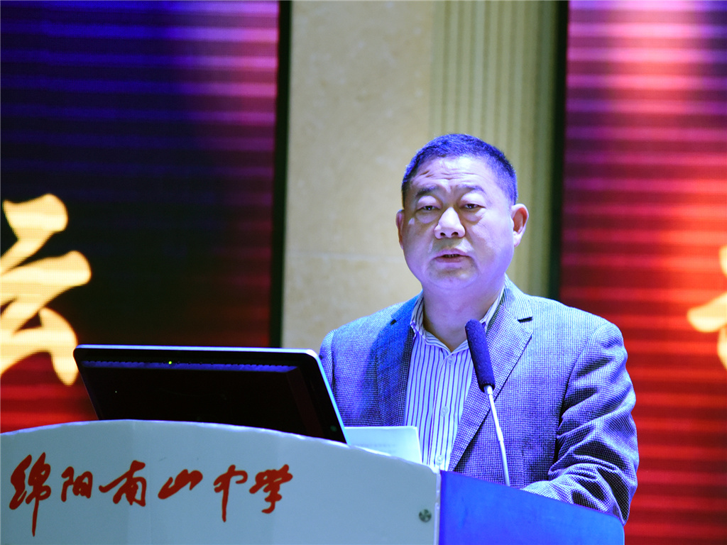 绵阳市教体局副局长古奇致欢迎词,他表示,绵阳市教体局将进一步推进四川云教联盟学校互通共融和资源共享,完善教育互联体系,构建教育鼎兴之路。
